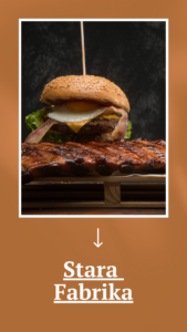 Dragi gostje, Stara Fabrka je znana po svojih ikoničnih burgerjih iz sestavin lokalnega izvora,  stejkih iz zorjenega slovenskega goveda, perutničkah, medaljončkih, trakcih in rebrcah, vrapih. Premium surovine in zanimivo industrijsko obarvani dizajn restavracije ter zanimiva poimenovanja jedi ter odlična postrežba kar kličejo po obisku. Brbončice mesoljubcev bodo hvaležne, niso pa pozabili tudi na vegane, saj ponujajo tudi veganski burger, veganski wrap in bbq vegansko rolo. Ljubitelji solat bodo prišli na svoj račun, saj se bodo lahko razvajali z različnimi bogatimi solatami. Ljubitelji sladic, ne skrbite, tudi za vas je poskrbljeno. Ponujajo vam sladice brez praškov in aditivov, ki jih pripravljajo sami. Ste že slišali za čokoladni mus s slano karamelo, bučnim oljem in ajdovimi kokicami? Sliši se božansko, mar ne?