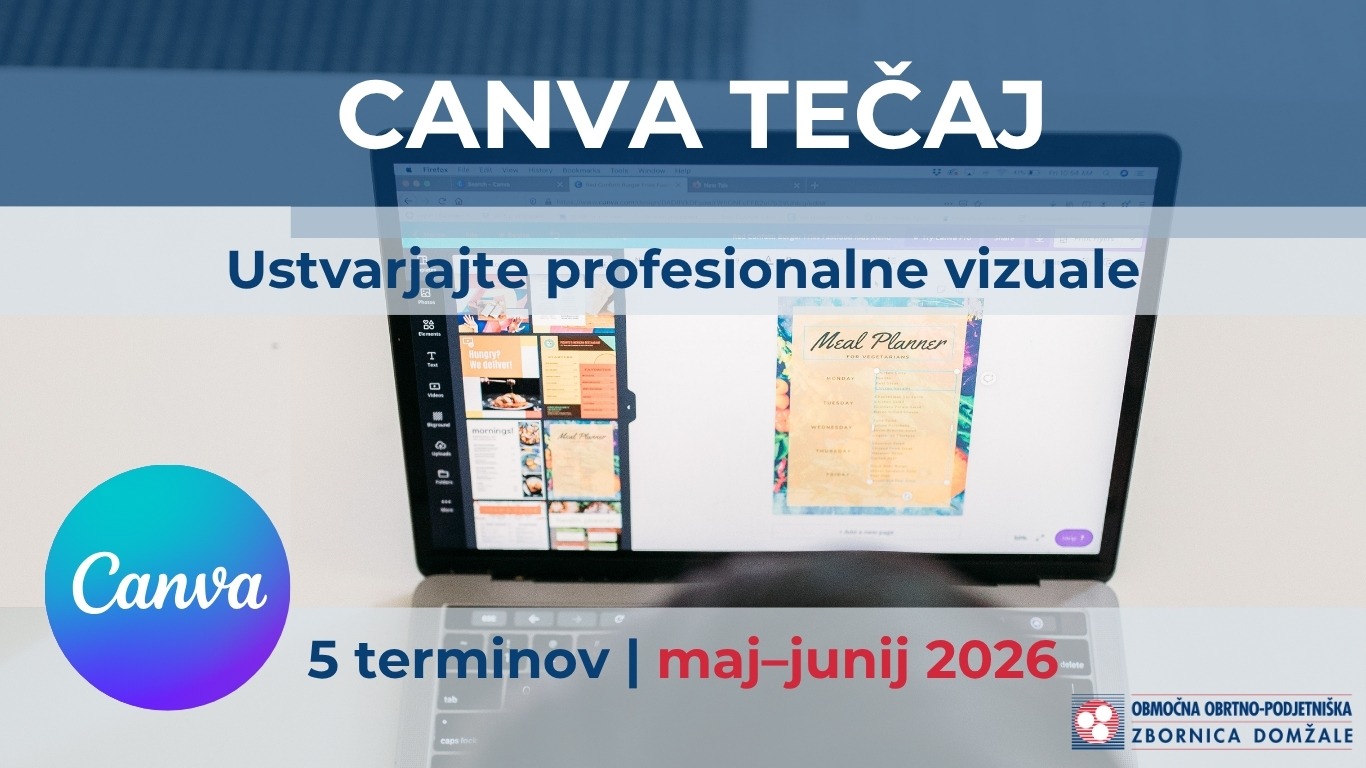 Območna obrtno-podjetniška zbornica Kamnik pripravlja praktičen tečaj uporabe Canve, namenjen podjetnikom, ki želijo izboljšati svojo vizualno komunikacijo. Program bo potekal v petih terminih med 5. majem in 2. junijem 2026 in udeležencem ponudil konkretna znanja za samostojno oblikovanje promocijskih materialov.